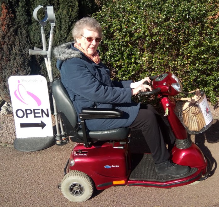 One of Shopmobility's members, returning after doing some shopping in Market Harborough town centre. She says that the use of our mobility scooters means that she can remain independent and visit the town's shops, which she would otherwise be unable to access.